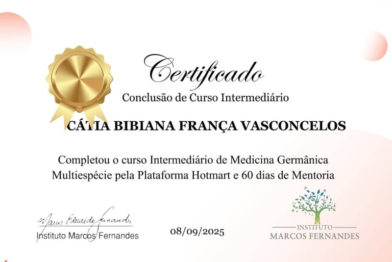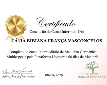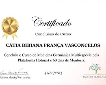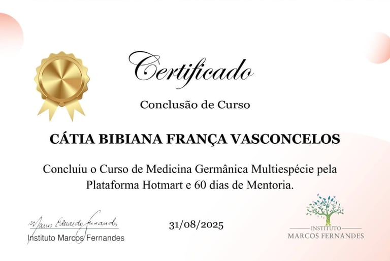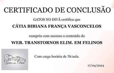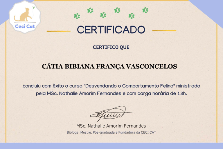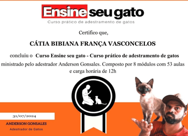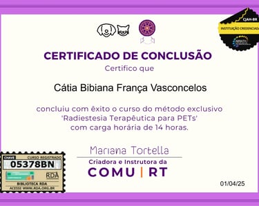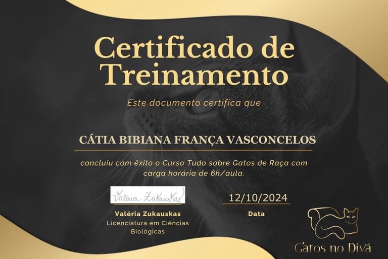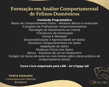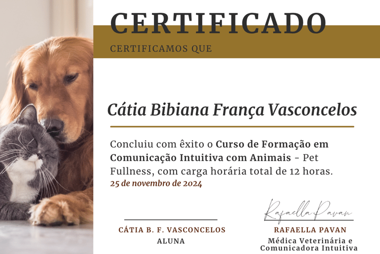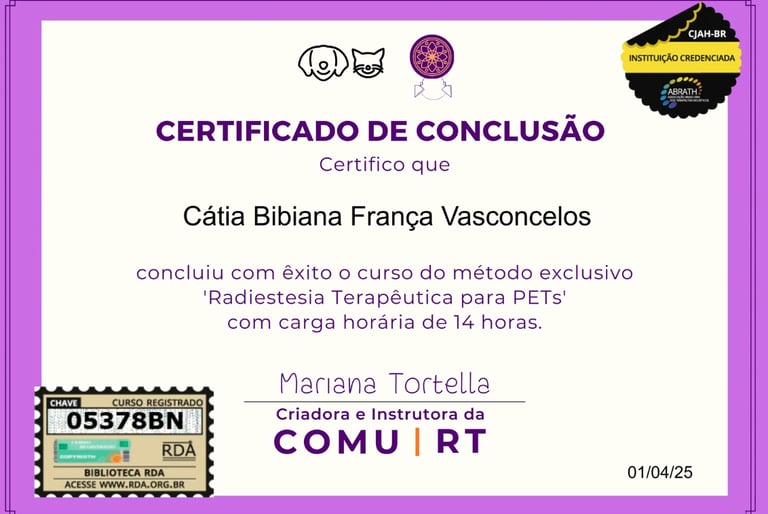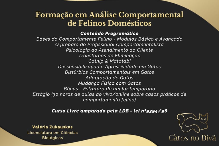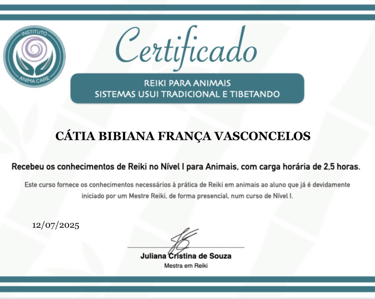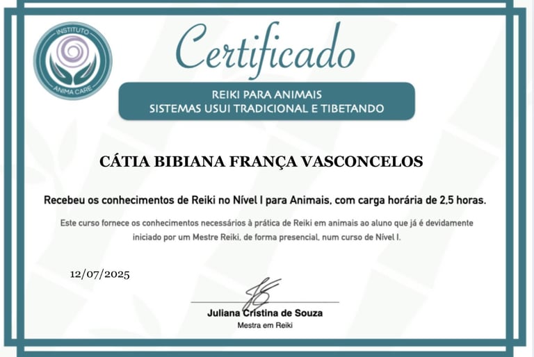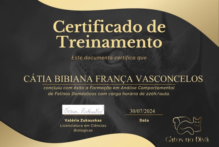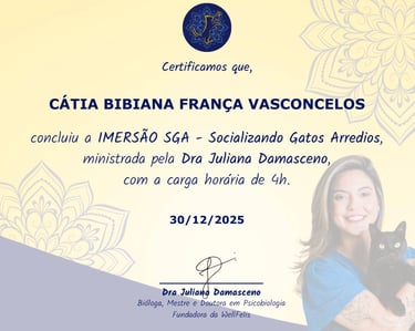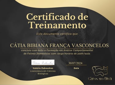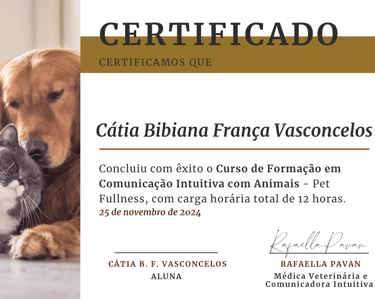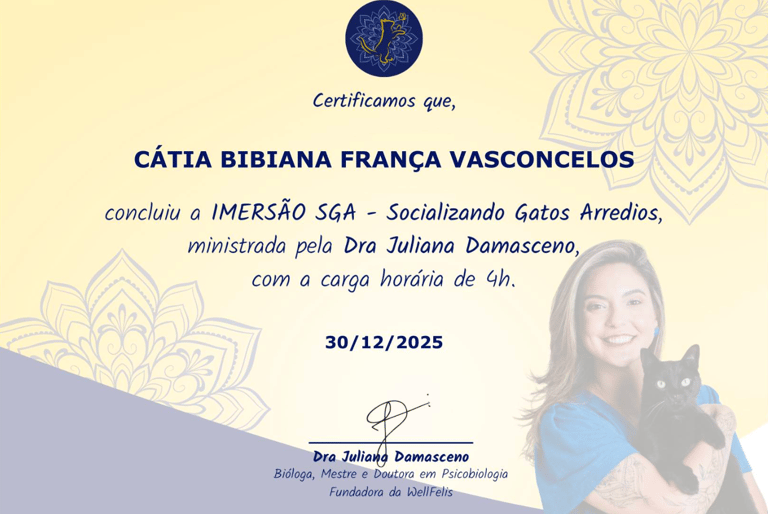 Formei-me em Análise Comportamental de Felinos Domésticos, Medicina Germânica Multiespécie, Clicker Training, Radiestesia, Reiki e Comunicação Intuitiva com Animais.